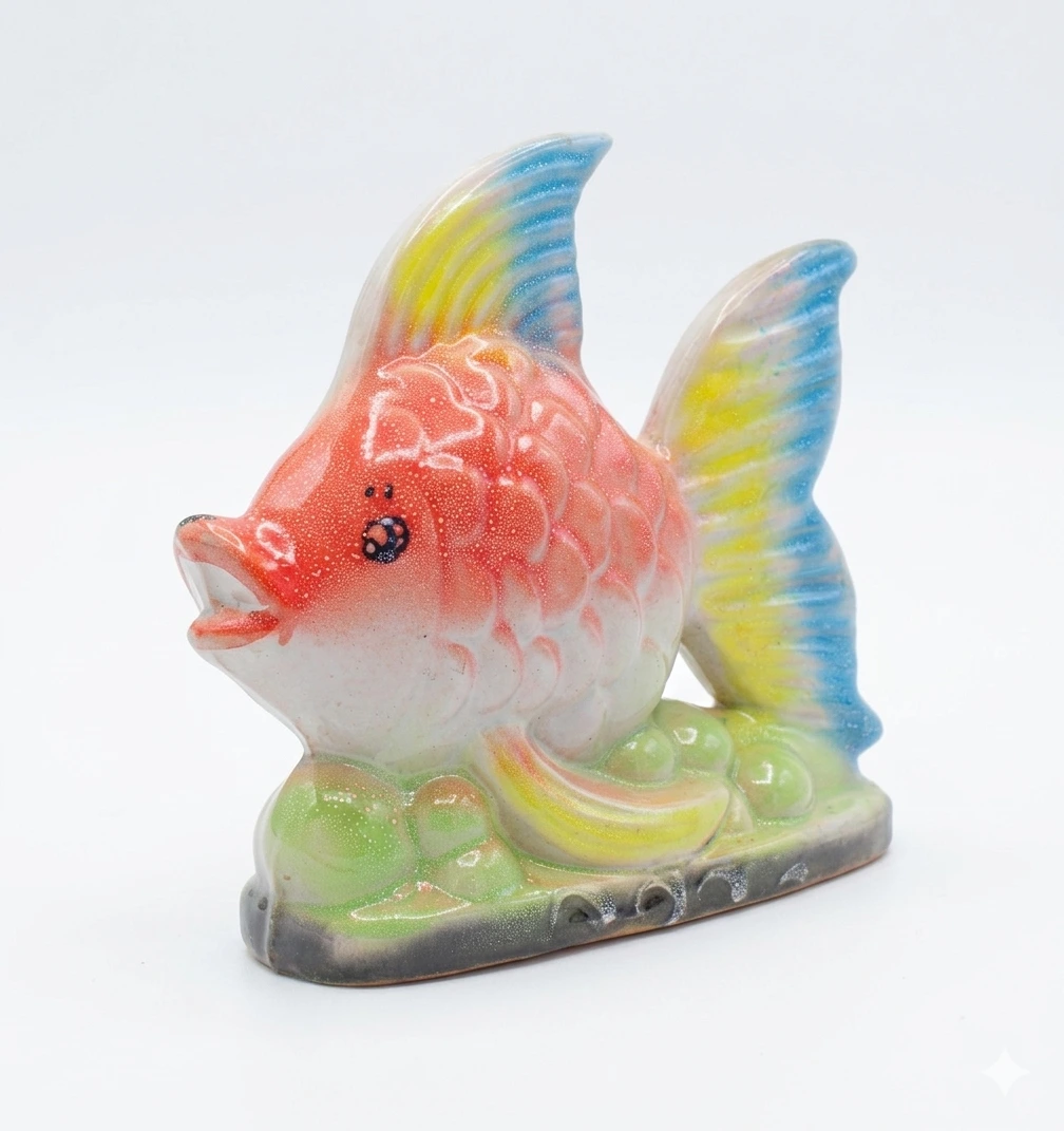 Add a burst of color and a touch of coastal charm to your interior with our Hand-Painted Rainbow Ceramic Fish. This artisan-crafted showpiece captures the whimsical beauty of tropical sea life. The body is finished in a speckled white glaze, transitioning into a vibrant coral-red, while the fins boast a striking yellow-to-blue gradient that mimics the movement of water.